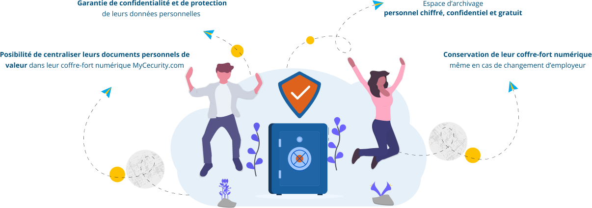 Le coffre-fort numérique personnel MyCecurity.com vous permet de mettre à disposition de vos salariés un espace d’archivage personnel et confidentiel leur permettant de retrouver et de conserver de manière sécurisée leurs bulletins de paie dématérialisés pendant 50 ans (ou jusqu’à leur 75 ans).